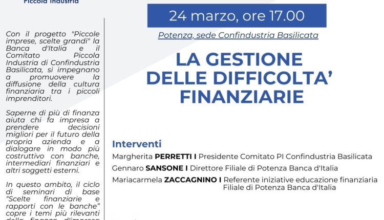 Lunedì 24 marzo, presso la nostra sede di Potenza, a partire dalle ore 17, si terrà il secondo seminario sull’educazione finanziaria per le PMI organizzato dal Comitato Piccola Industria in collaborazione con la filiale di Potenza di Banca d’Italia.