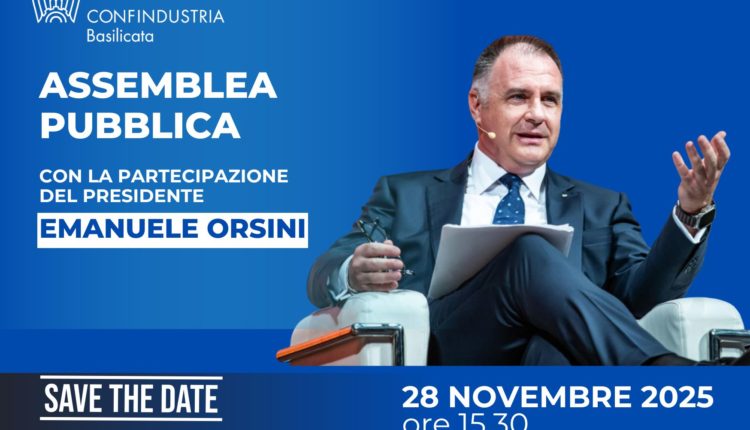 Il  28 novembre 2025, a Matera, presso UNAHOTELS MH Matera, a partire dalle 15.30, si terrà l‘Assemblea pubblica di Confindustria Basilicata, con la partecipazione del Presidente di Confindustria, Emanuele Orsini.