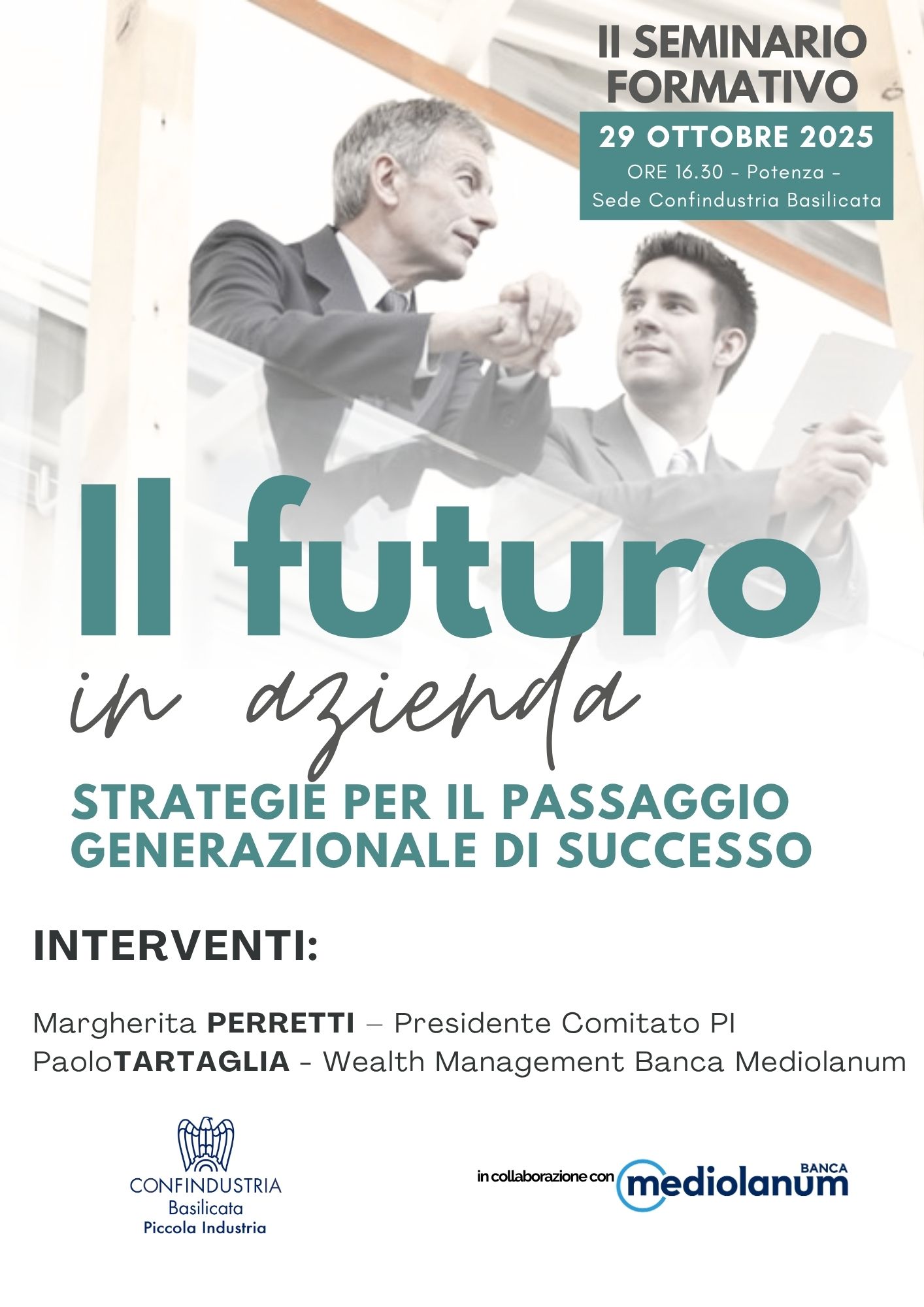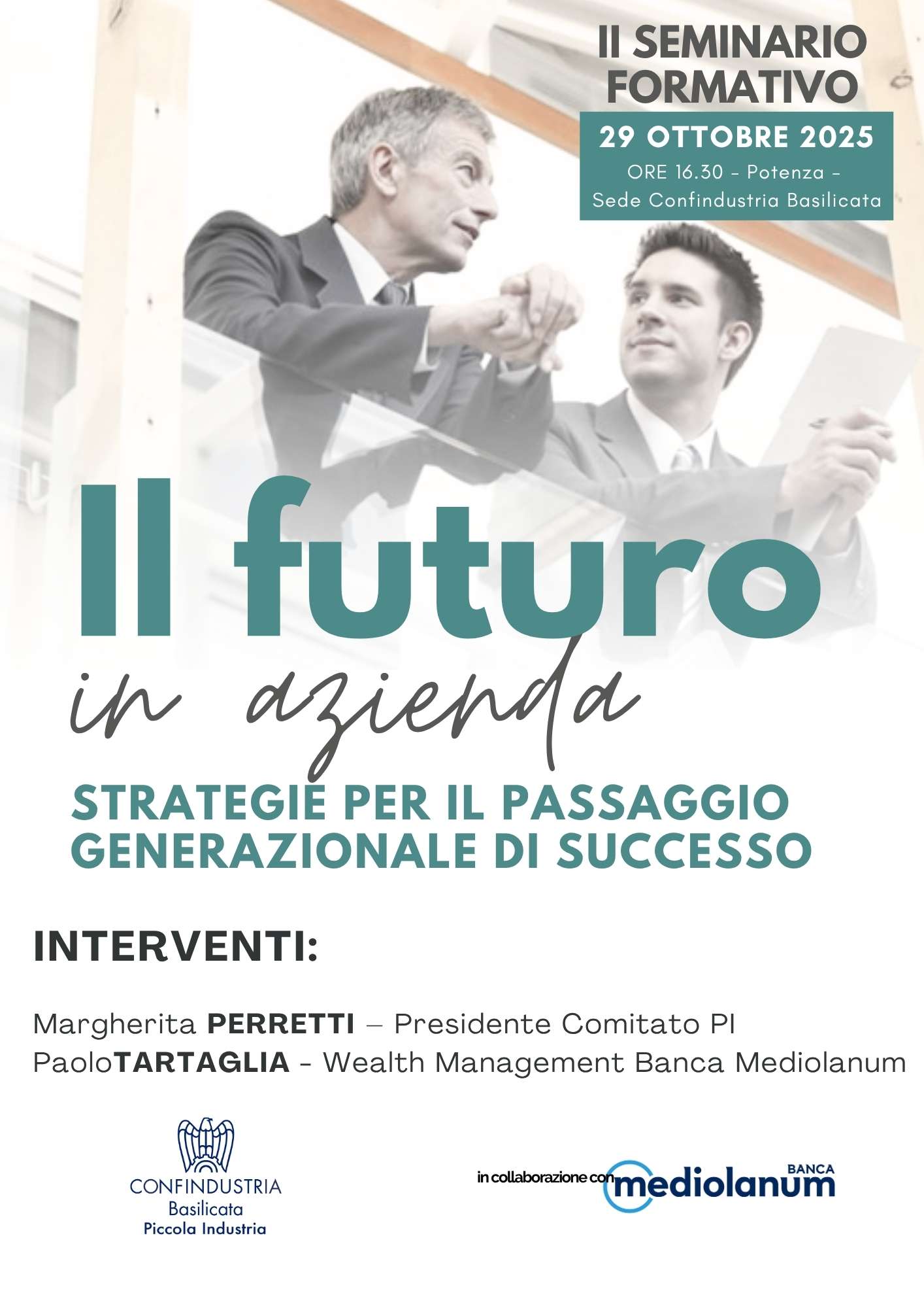 Il 29 ottobre, alle ore 16.30, presso la nostra sede di Potenza, si terrà il seminario formativo organizzato dalla Piccola Industria di Confindustria Basilicata in collaborazione con Banca Mediolanum dedicato al tema “Il futuro in azienda. Strategie per il passaggio generazionale di successo“.