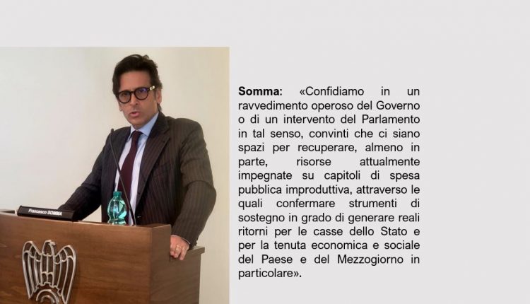 Confidiamo, dunque – ha concluso Somma – in un ravvedimento operoso del Governo o in un intervento del Parlamento in tal senso, convinti che ci siano spazi per recuperare, almeno in parte, risorse attualmente impegnate su capitoli di spesa pubblica improduttiva, attraverso le quali confermare strumenti di sostegno in grado di generare reali ritorni per le casse dello Stato e per la tenuta economica e sociale del Paese e del Mezzogiorno in particolare”.