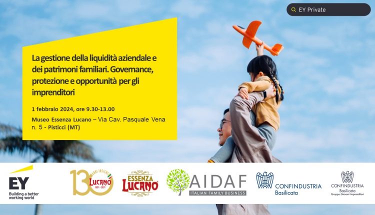 Confindustria Basilicata, in collaborazione con Ernst & Young, Lucano 1894 e AIDAF – Italian Family Business, promuove l’evento dedicato a “La gestione della liquidità aziendale e dei patrimoni familiari. Governance, protezione e opportunità per gli imprenditori che si terrà l‘1 febbraio presso il Museo d’Impresa Essenza Lucano, con le operazioni di accredito che partiranno dalle ore 9.30.