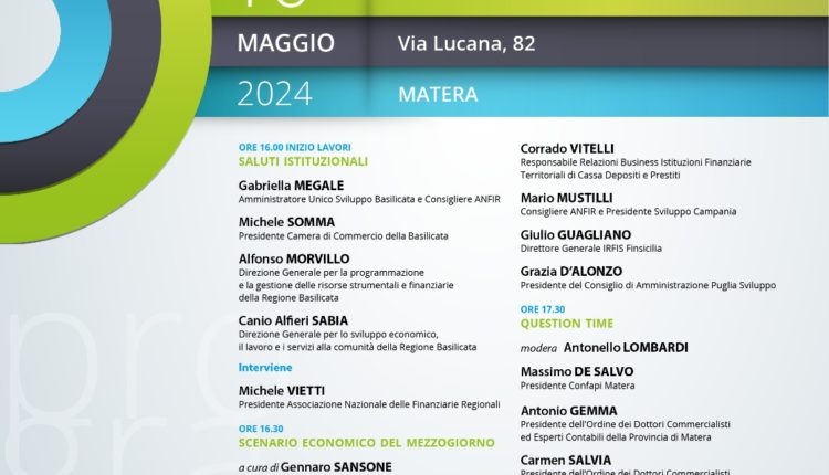 Il 16 maggio, a partire dalle ore 16, presso la sede di Matera Camera di Commercio della Basilicata (via Lucana, 82) si terrà il convegno “Innovazione finanziaria. Nuovi strumenti per prospettive future“, organizzato da Regione Basilicata, Sviluppo Basilicata, Inchubatori e Associazione Nazionale Finanziarie Regionali.