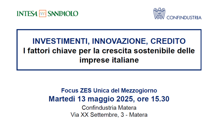 martedì 13 maggio, nella nostra sede di Matera (via XX settembre, n.3), verrà presentato l’accordo di collaborazione tra Intesa Sanpaolo e Confindustria “INVESTIMENTI, INNOVAZIONE, CREDITO. I fattori chiave per la crescita sostenibile delle imprese italiane” che mira a favorire modelli produttivi innovativi, transizione 5.0 e intelligenza artificiale, al fine di promuovere la competitività delle imprese in Italia e a livello internazionale.