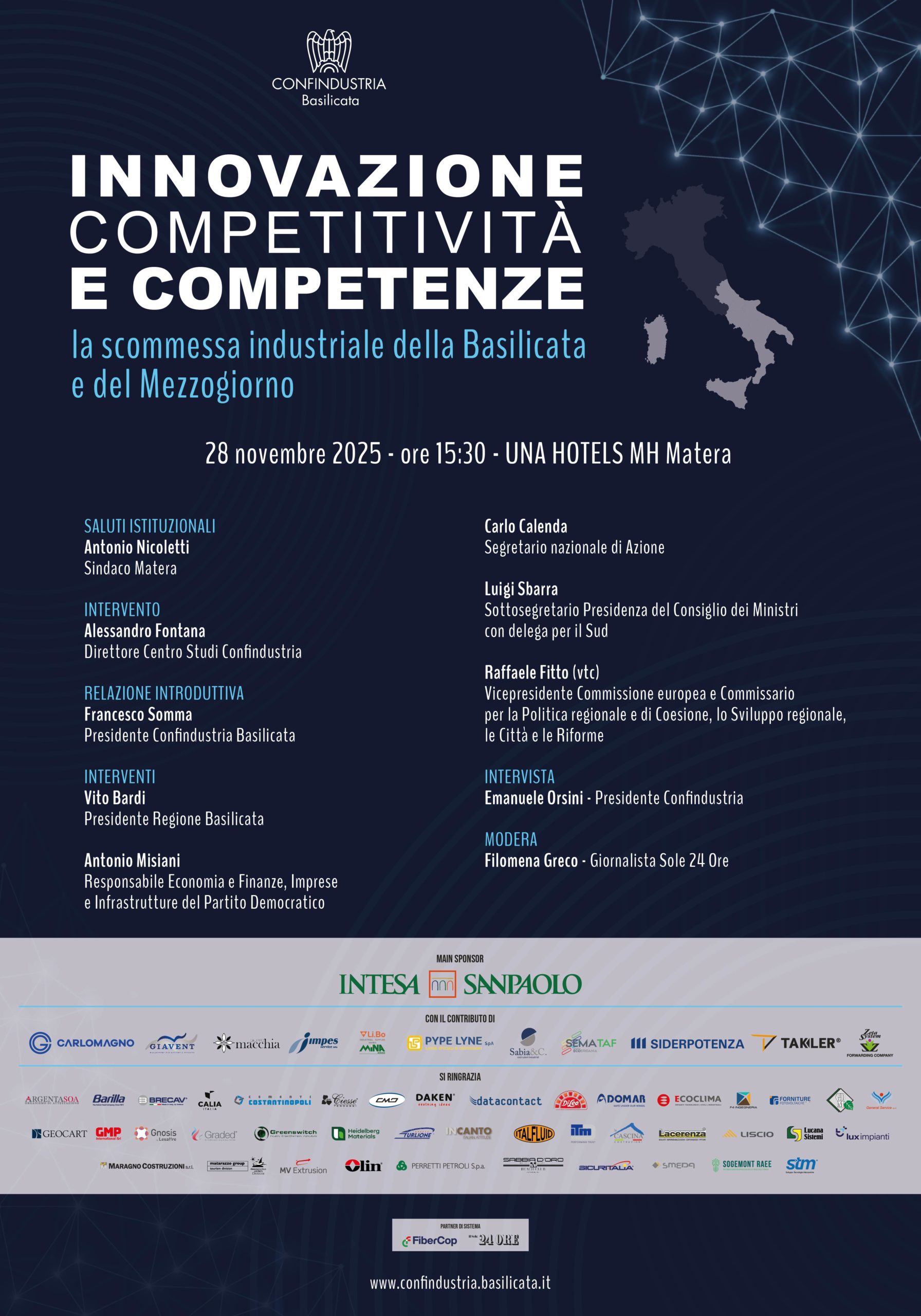 si inoltra, di seguito, il programma dei lavori dell’Assemblea Pubblica di Confindustria Basilicata che si terrà il prossimo 28 novembre, a Matera: