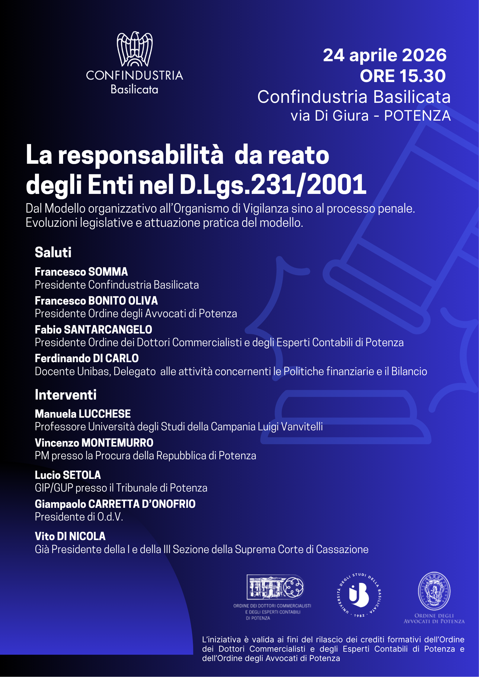 “La responsabilità da reato degli enti nel D.Lgs. 231/2001: dal modello organizzativo all’Organismo di Vigilanza, sino al processo penale. Evoluzioni legislative e attuazione pratica del modello”.