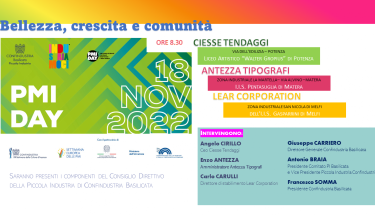 Anche sul territorio, il nostro Comitato della Piccola Industria ha inteso promuovere l’iniziativa che si articolerà in tre appuntamenti per far conoscere da vicino altrettante eccellenze produttive: gli studenti del Liceo Artistico “Walter Gropius” di Potenza faranno visita alla Ciesse Tendaggi; le classi dell’IIS Pentasuglia di Matera saranno ospiti di Antezza Tipografi mentre i ragazzi del Gasparrini di Melfi potranno conoscere da vicino l’azienda Lear Corporation che produce componenti per le produzioni Stellantis.