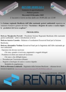 La Sezione regionale Basilicata dell’Albo gestori ambientali ha organizzato, per il giorno 10 dicembre 2025, un evento formativo gratuito, rivolto alle imprese, dal titolo: “RENTRI MODULO 2: Iscrizione e Registro di carico e scarico digitale – produttori del terzo scaglione” con l’obiettivo di fornire informazioni sugli aspetti operativi del RENTRI, e sugli adempimenti in vista della scadenza del 13/02/2026.