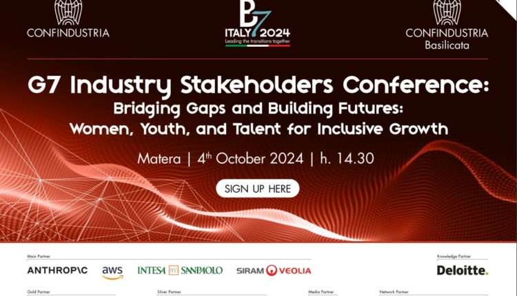 Nell’ambito delle attività realizzate dal B7 Italy 2024, il prossimo 4 ottobre si terrà a Matera, a partire dalle h. 15.00 presso il CineTeatro comunale Guerrieri, la G7 – Industry Stakeholders Conference – Bridging Gaps and Building Futures: Women, Youth, and Talent for Inclusive Growth, organizzato con il supporto di Confindustria Basilicata a margine della Ministeriale G7 sulle Pari Opportunità di Matera.